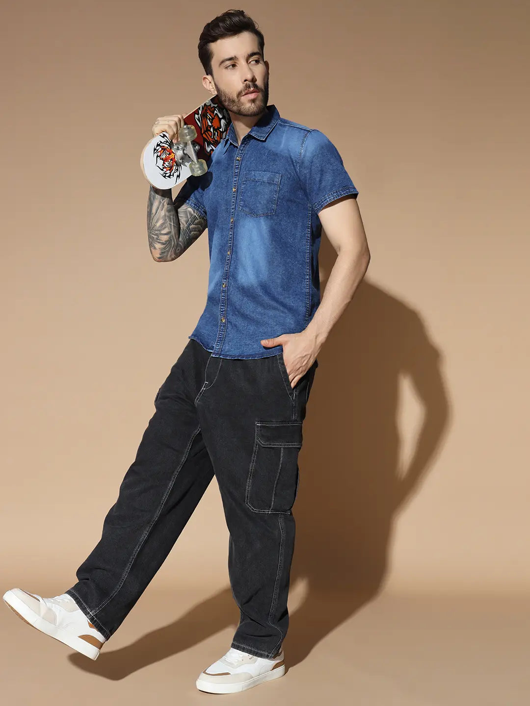 SHORT SLEEVE SINGLE POCKET BLUE SILK DENIM SHIRT